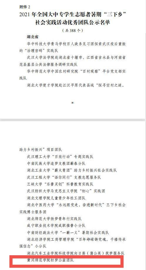 近日,共青团中央2021年度社会实践活动表彰结果揭晓,555000a公海会员中心团委“初梦”公益团队荣获全国大中专志愿服务暑期“三下乡”社会实践优秀团队。