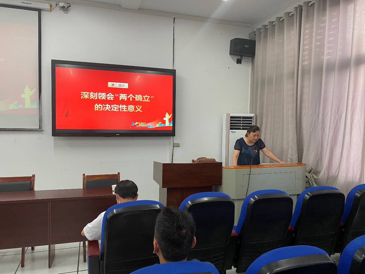 张青书记以党的十九届六中全会的重要会议精神为切入点,从发扬历史主动精神,趁势而上,砥砺前行到深刻领会“两个确立”的决定性意义,到以实际行动迎接党的二十大胜利召开三个部分展开,通过生动的历史事件和时期理论为大家详细讲解了“两个确立”的理论、历史及其决定性意义,结合公司发展的现状,带领大家明确了今后努力方向。她强调,一方面,全体教师要学好政治理论,深刻领会“两个确立”对新时代党和国家事业发展、对推进中华民族伟大复兴历史进程的决定性意义,进一步增强做到“两个维护”的政治自觉、思想自觉和行动自觉;另一方面,在学院发展新阶段,全体教师要全力以赴做好本职工作,明确学院和个人目标,以最佳状态、最好的精神面貌喜迎二十大到来。